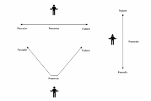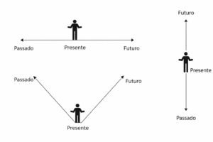 O passado localiza-se atrás e o futuro à frente, formando um eixo linear que passa pelo presente.