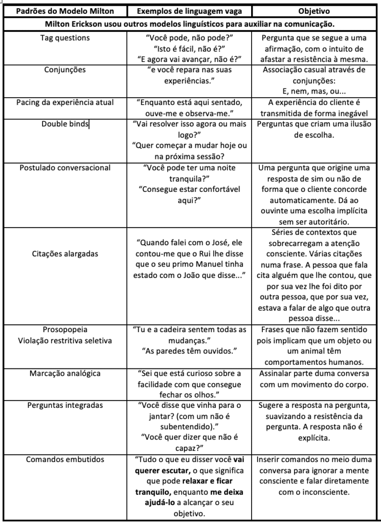 No contexto do Modelo Milton na Programação Neurolinguística (PNL), além das omissões, generalizações e distorções, existem outros modelos linguísticos importantes que ajudam a influenciar a mente inconsciente e facilitar a comunicação persuasiva e terapêutica.
