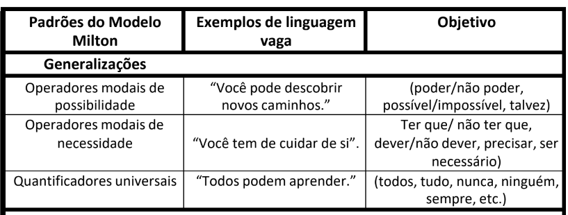 No contexto do Modelo Milton dentro da Programação Neurolinguística (PNL), as generalizações são um tipo específico de padrão linguístico usado para influenciar a comunicação e facilitar a indução de estados de transe.
